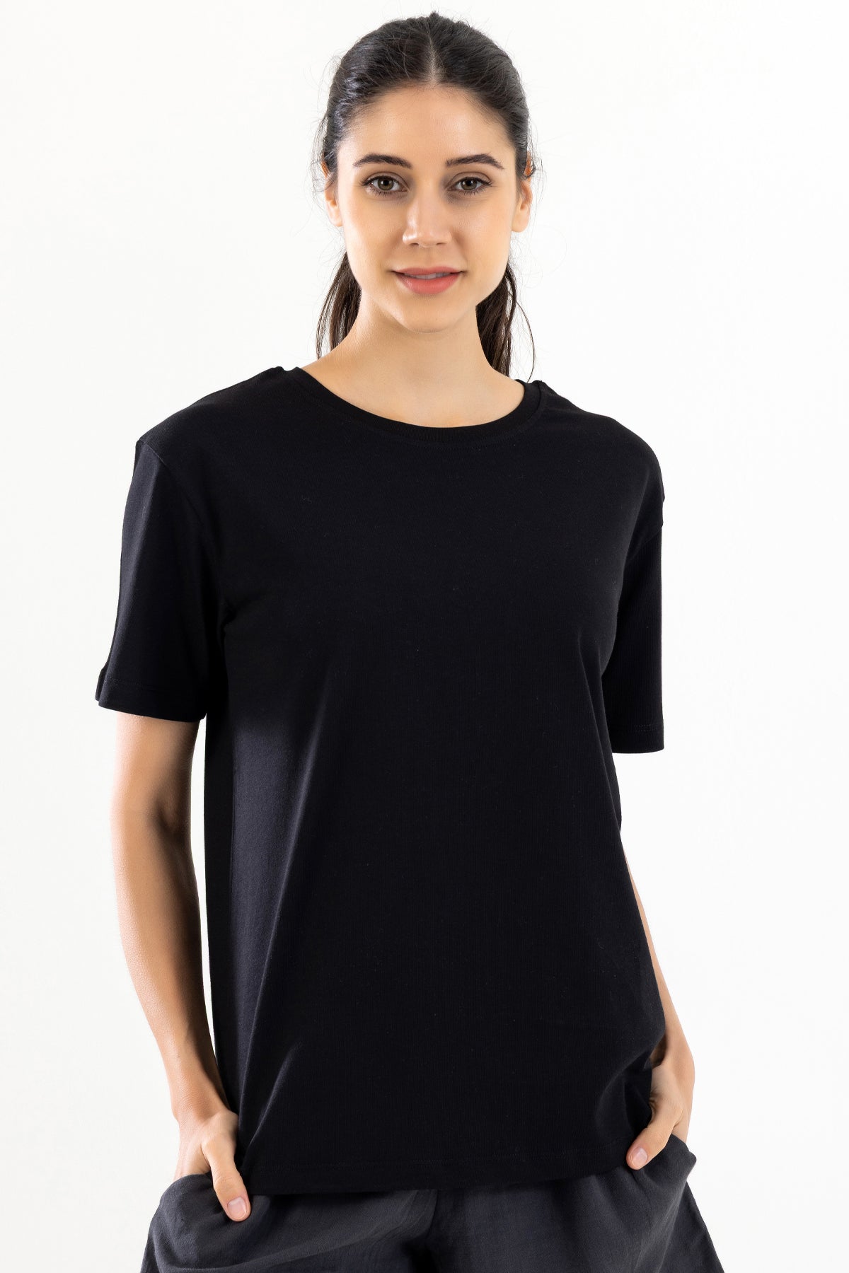 %100 pamuklu basic tişört, yumuşak dokusu ve nefes alabilen yapısıyla gün boyu konfor sunar. Kısa kollu ve sade tasarımı sayesinde hem günlük kombinlerinizde hem de katmanlı stillerde rahatlıkla kullanabilirsiniz.