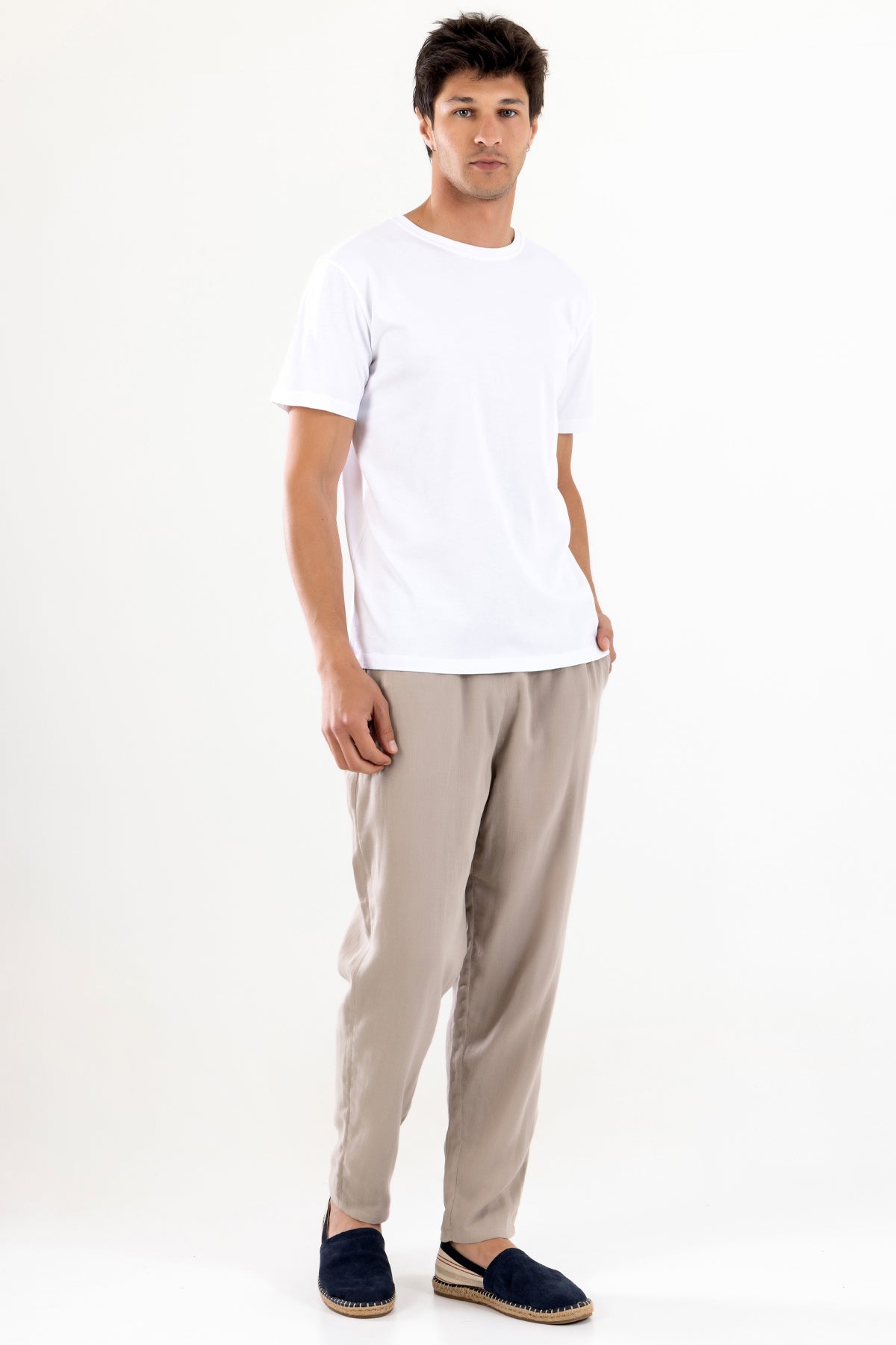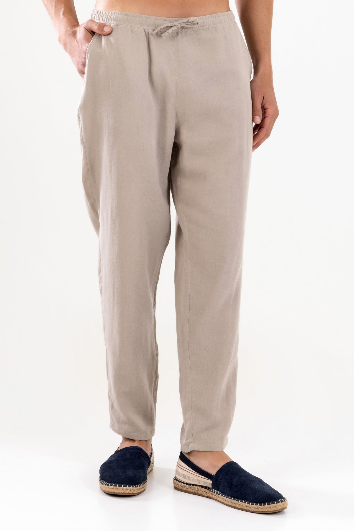 Dar Paça Beli Bağcıklı Erkek Müslin Pantolon - Bej